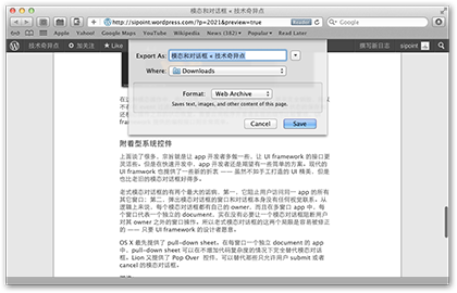 模态对话框也源自类似的妥协,我称之为「系统范化 hack 」。将本该由软件设计者承担的责任过多地由系统和 UI framework 代劳,根源在于对非功能性需求的轻视。OS X 和 iOS 将用户体验提升为最重要的竞争指标,「系统范化 hack 」也失去了立足的基础。