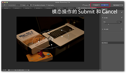 如果模态过程和整体 UI 的融合度非常低,应该考虑让主窗口整体进入模态。Photoshop 的 Filter plug-in 是采用模态对话框实现的。但是近年来随着新出现的 Filter UI 越来越复杂,新的 Filter 如 CS6 版本的 Lighting Effect 和 Field Blur 均采用了主窗口整体模态的方式,在 Filter 工作时不再弹出模态对话框,而是将整个 Photoshop 主窗口切换为 Filter Workspace。