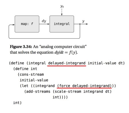 其中 map 和 integral 的定义相互依赖 (上图的 code 片段中,integral 函数的 delayed-integrand 的传入实参就是 map 函数),所以 integral 中依赖 map 的参数必须设计为延迟取值。听起来很玄,不过你只要把「延迟求值」设想为 pass-by-reference (即传入的不是 map 函数的指针而是函数指针的地址,因为这个函数指针在 integral 被调用之后才被赋予合法值),把 force 想像成 dereference (也就是 C 里著名的 * 操作符) 就一目了然了。这与 C 语言里定义相互依赖的类型时用指针来代替实际类型没有本质区别。