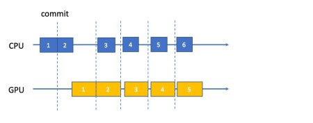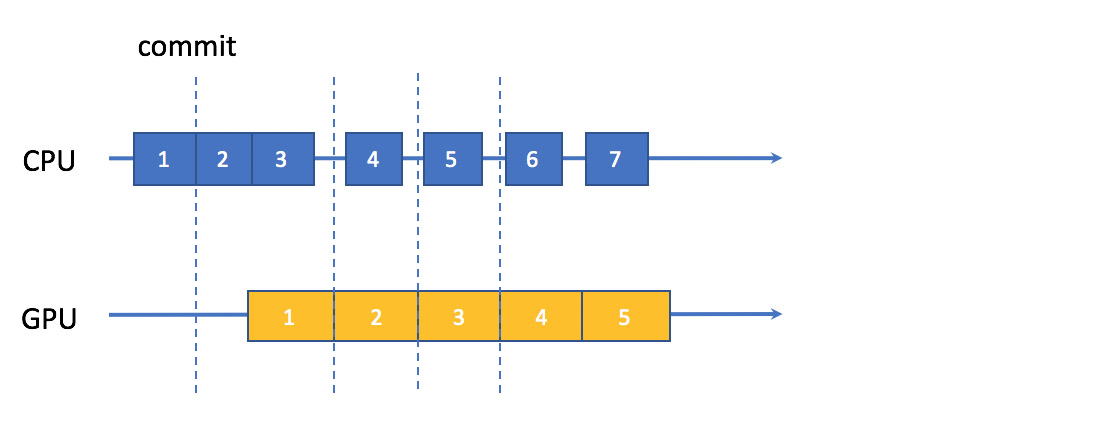 虽然 CPU-GPU 的固有延时并不能通过本篇讨论精确得出,但从图 6 和图 5 来考虑,不妨大致假设为每个 frame encoding 时长的 3/4。如果把 in-flight 最大数设置为 2,系统的时序如图 7 所示。