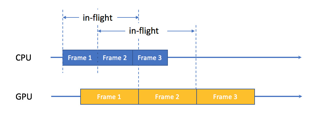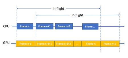 采用基于 semaphore 的同步方式,多于一个 in-flight 的系统就可以缩短空闲时间。对于 GPU-bound 应用,通常三个 in-flight 能完全消除等待时间。OpenGL 没有跟踪 in-flight 的能力,其 double-buffer 只能消除闪烁。过多和过少的 in-flight 数目都对性能起负面作用。